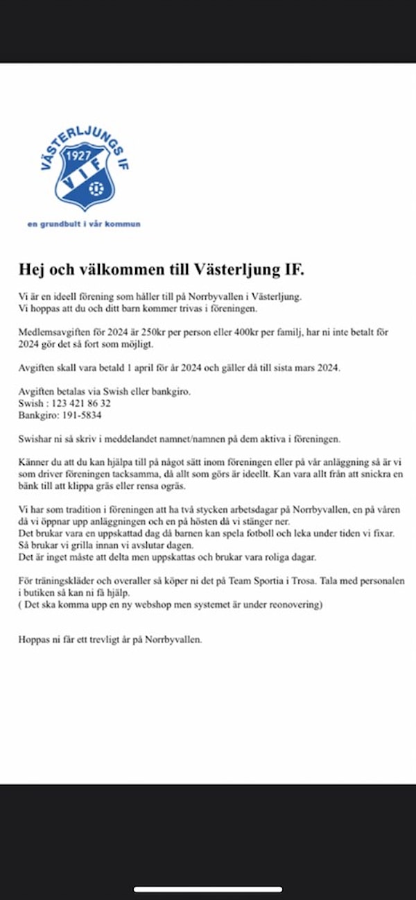 Klicka på bekräftelselänken i det mejl vi skickat dig för att börja ta emot uppdateringar från Västerljungs IF.