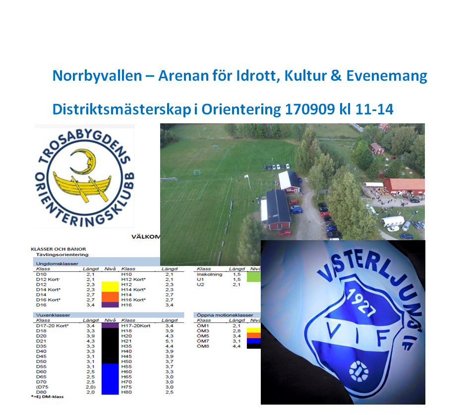 Idag lördag 9 september hälsar VIF 500 orienterare välkomna! Det är vår grannförening Trosabygdens orienteringsklubb som sett vilka fina möjligheter det finns till orientering i skogarna väster om Norrbyvallen. De arrangerar nämligen Distriktsmästerskap. Och så frågade de om de fick vara på Norrbyvallen för start och mål, omklädning och dusch, fika och prisutdelning mm. Vi i styrelsen tyckte detta var ett bra tillfälle att visa att Norrbyvallen går att använda till ändå mer än den fotboll som redan spelas. Så vi beslutade att låta TBOK genomföra detta evenemang hos oss. Så har du inte något för dig, ta dig gärna en sväng förbi mellan kl 11-14. Jag är övertygad om att du blir imponerad över alla stora och små orienterare och kanske hittar du lite fika och käk att köpa? Vi kommer nu kunna lägga även orienteringstävling till Norrbyvallens lista med evenemang. Sedan tidigare har vi: - Fotboll såklart, i alla dess former - Kulturfnatt 2015 - Skoljogg varje år - Skolbrännboll - Midsommarfirande - Hundarena - Logdans - Musikvideoinspelningsplats (Jo, det är sant!) - Allsång i Ladan - Hela socknen bakar - Och nu alltså Orientering Vi önskar TBOK och alla orienterare lycka till idag med sitt stora evenamang. Och säkert är det något som vi i VIF kan lära oss efter dagens tävling för att det ska funka ändå bättre framöver. Så har du ett evenemang eller liknande som du ser skulle kunna passa på Norrbyvallen. Tveka inte att höra av dig! Jonas Knutsson, ordföranden Norrbyvallen - Arenan för Idrott, Kultur & Evenemang